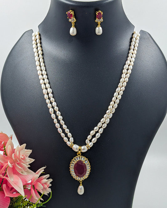 Pearl and Ruby Pendant Necklace Set With Earrings