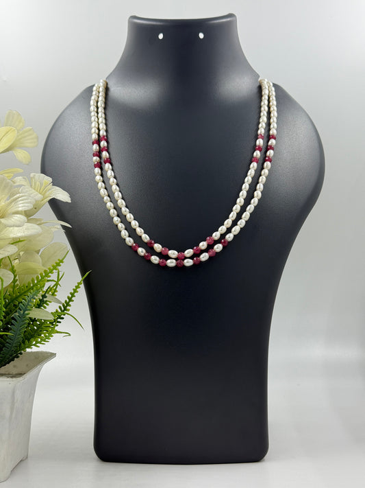 Double-Strand White Pearl & Ruby Red Bead Necklace