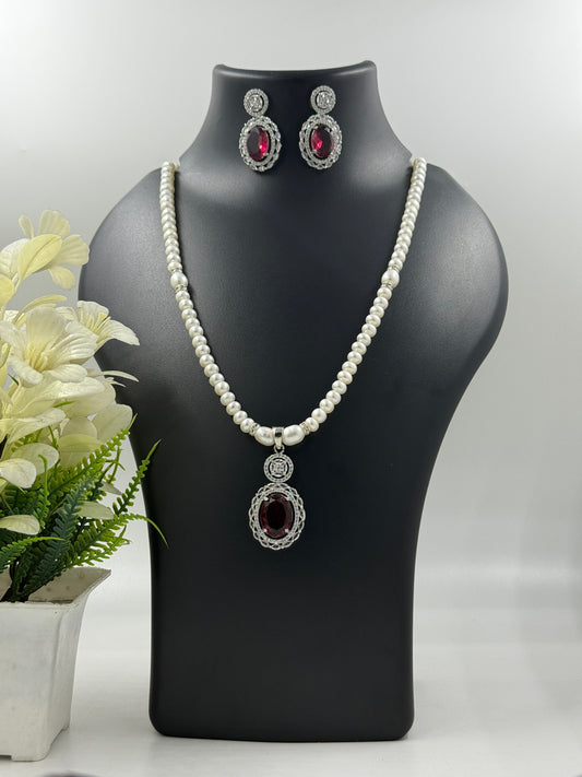 Single Strand Pearls with Red Oval CZ Pendant & Earrings