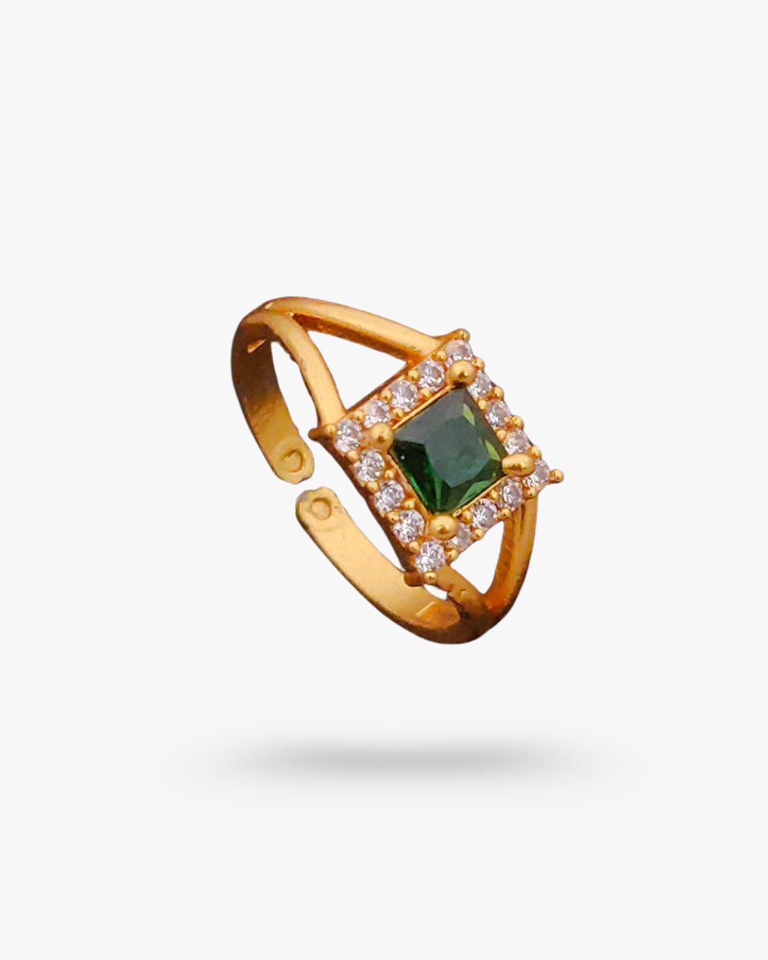 This exquisite finger ring features a captivating, square-cut emerald set at the center of a sleek, gold band. The emerald, known for its rich green hue that symbolizes growth and renewal, is nestled within a unique geometric setting that enhances its natural beauty. Surrounding the central stone is a halo of sparkling diamonds that add an extra layer of brilliance to the design. The band itself is crafted from polished gold, whose warm tones complement the verdant gemstone perfectly. This ring is not only an elegant accessory but also a statement piece that could serve as a cherished heirloom or a memorable gift for special occasions.