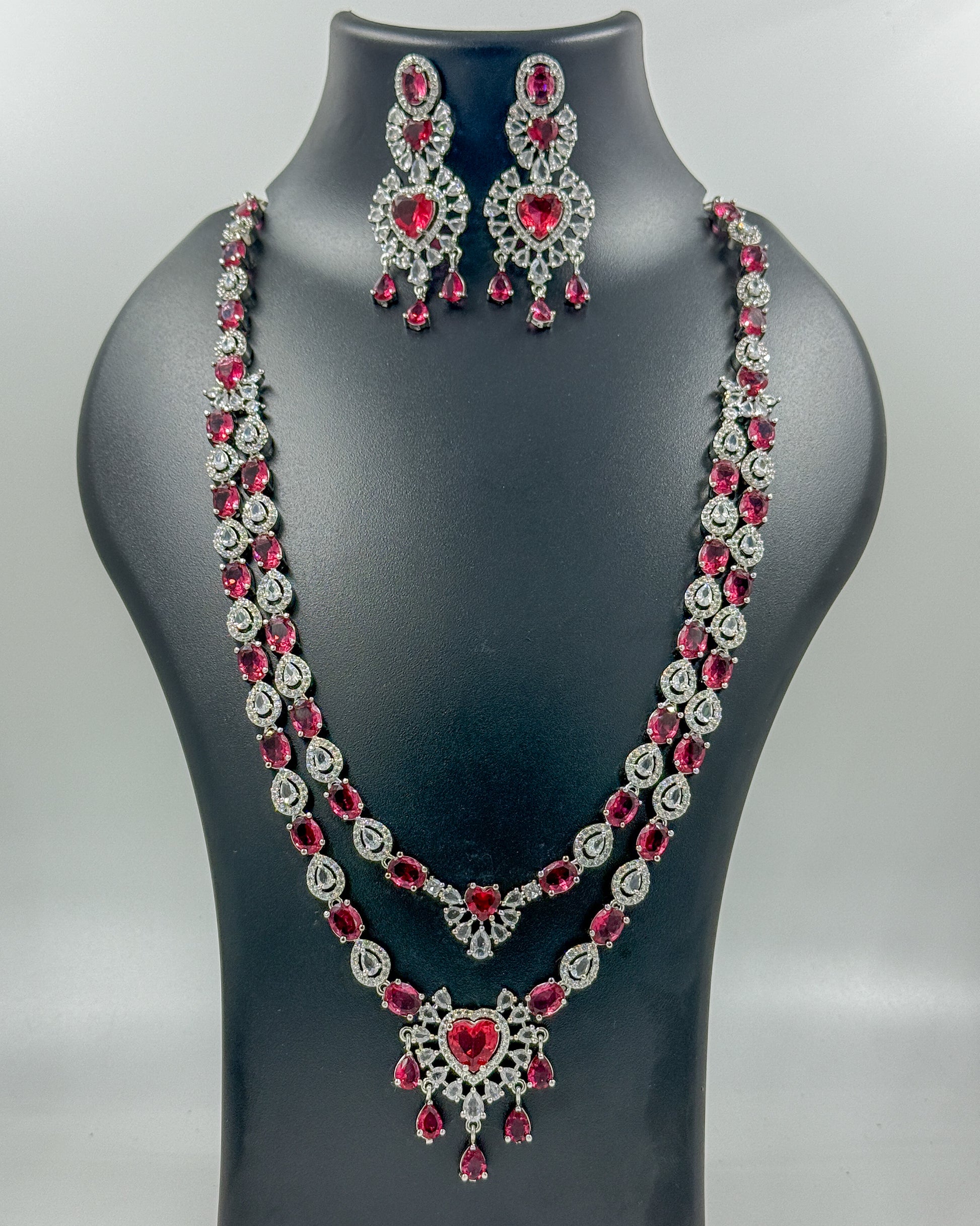 Declare your regal style with the Gulabi Dilhaar Ruby Heart American Diamond Necklace Set. This breathtaking double-layered necklace is a testament to opulent craftsmanship, featuring a dazzling array of brilliant American Diamonds (CZ stones). The design is spectacularly accented with rich ruby-red, heart-shaped stones that add a passionate burst of color and a touch of romance. A grand heart-shaped pendant forms the focal point, creating a truly majestic look. Accompanied by magnificent matching drop earrings, this set is an absolute showstopper. Perfect for bridal wear, grand festive occasions, or a lavish reception, it promises to illuminate your presence with unparalleled sparkle and charm.
