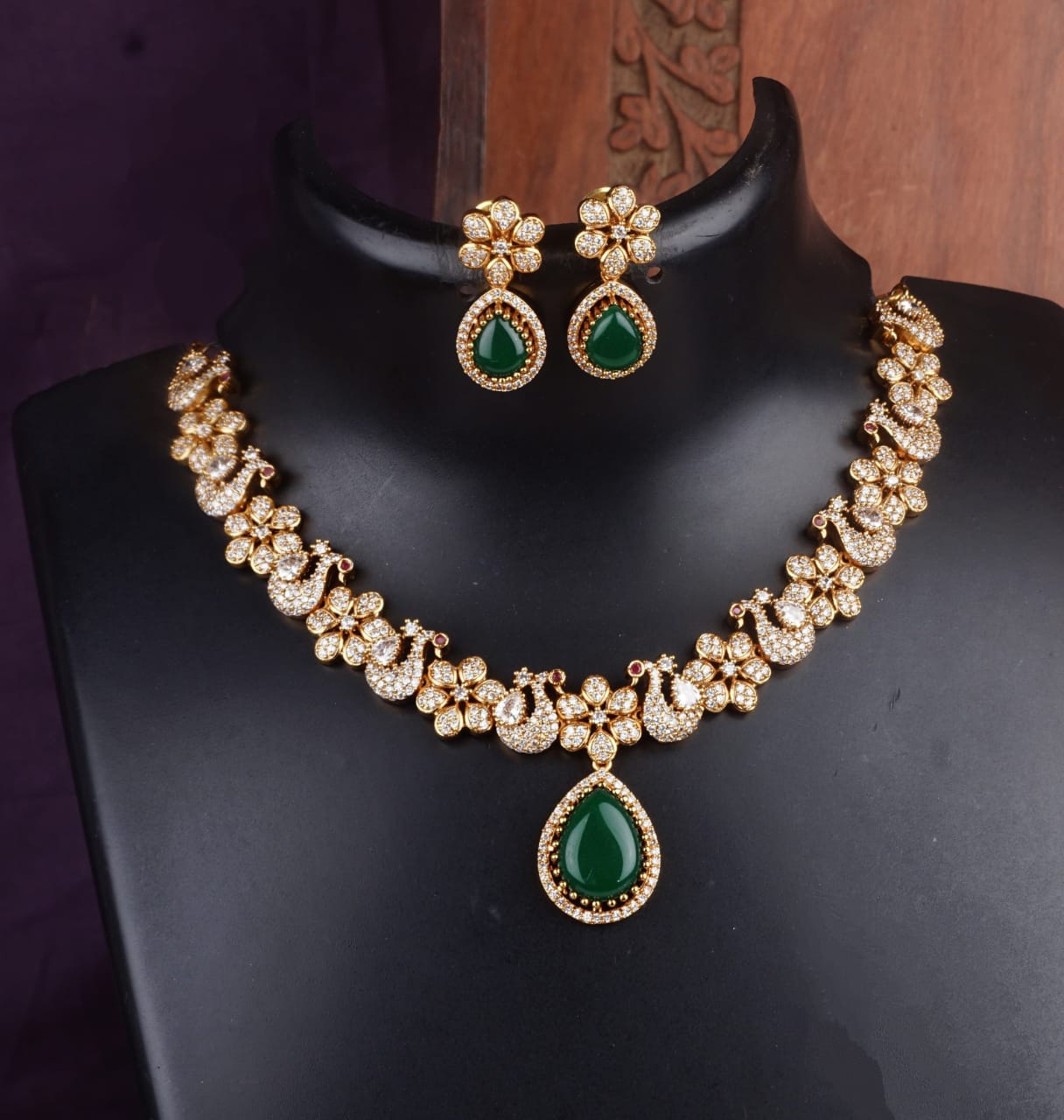 No necklace set is complete without a pair of matching earrings. The Mozo Night Necklace Set includes a pair of floral-inspired earrings, designed to complement the peacock theme.