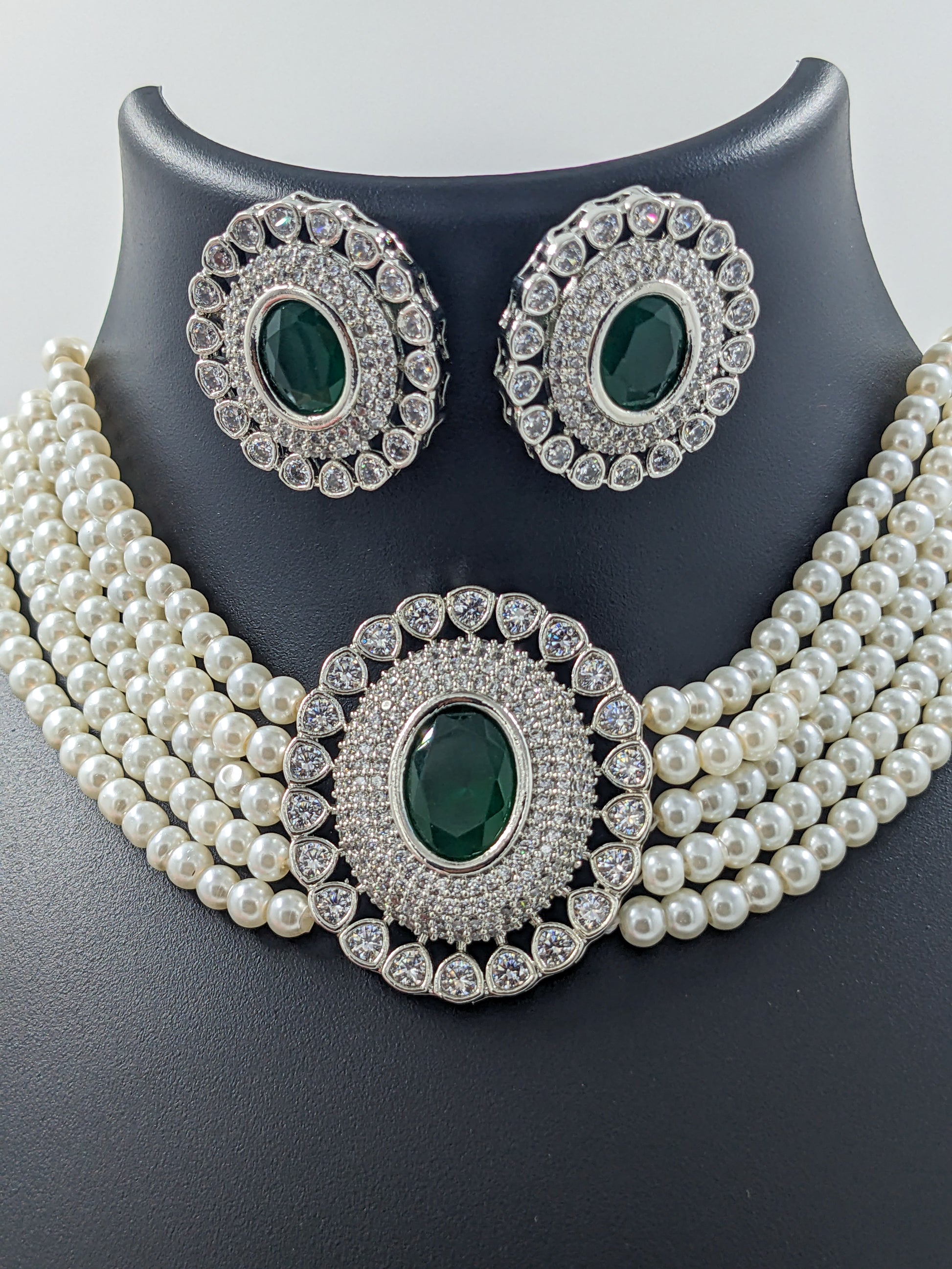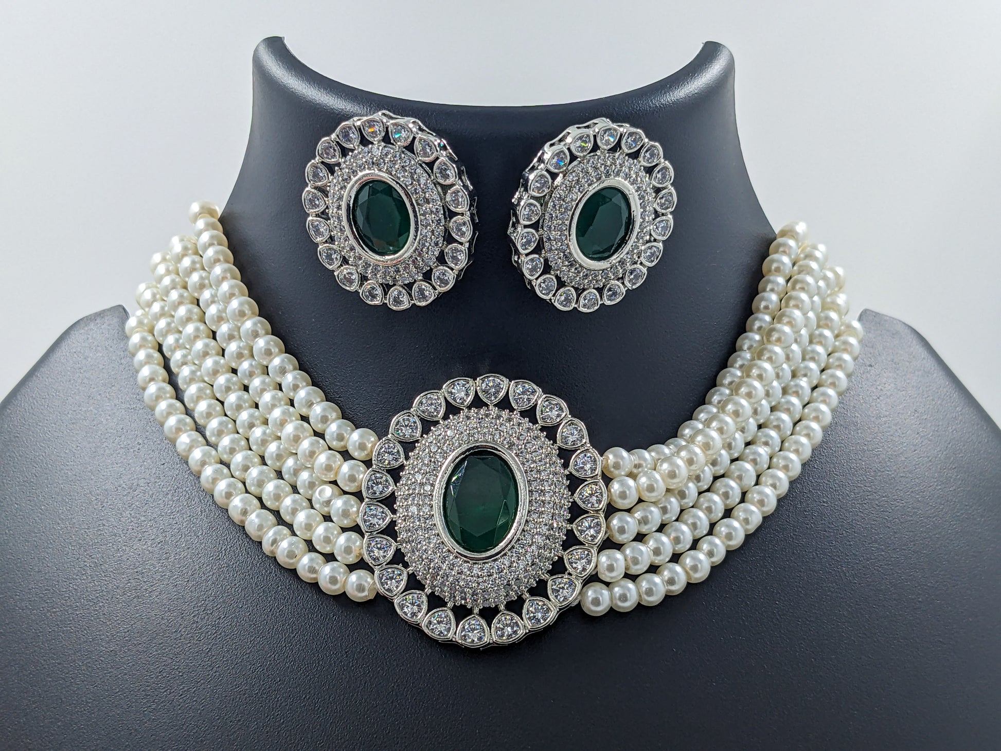 Pearl and Emerald Choker Necklace Set With Earrings For Gifting