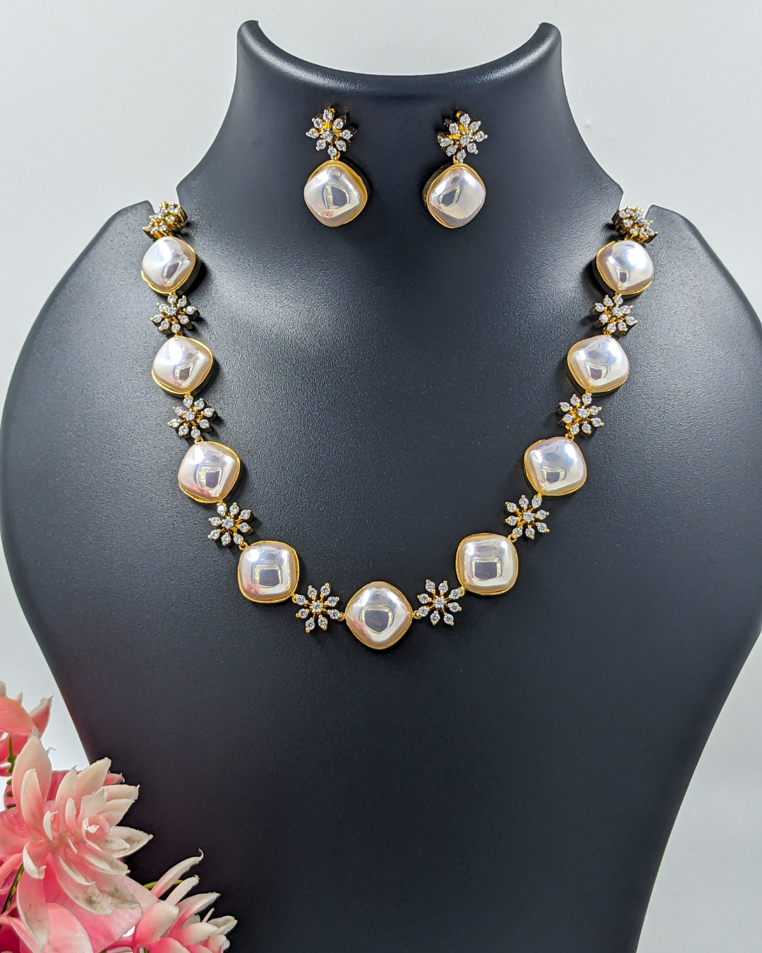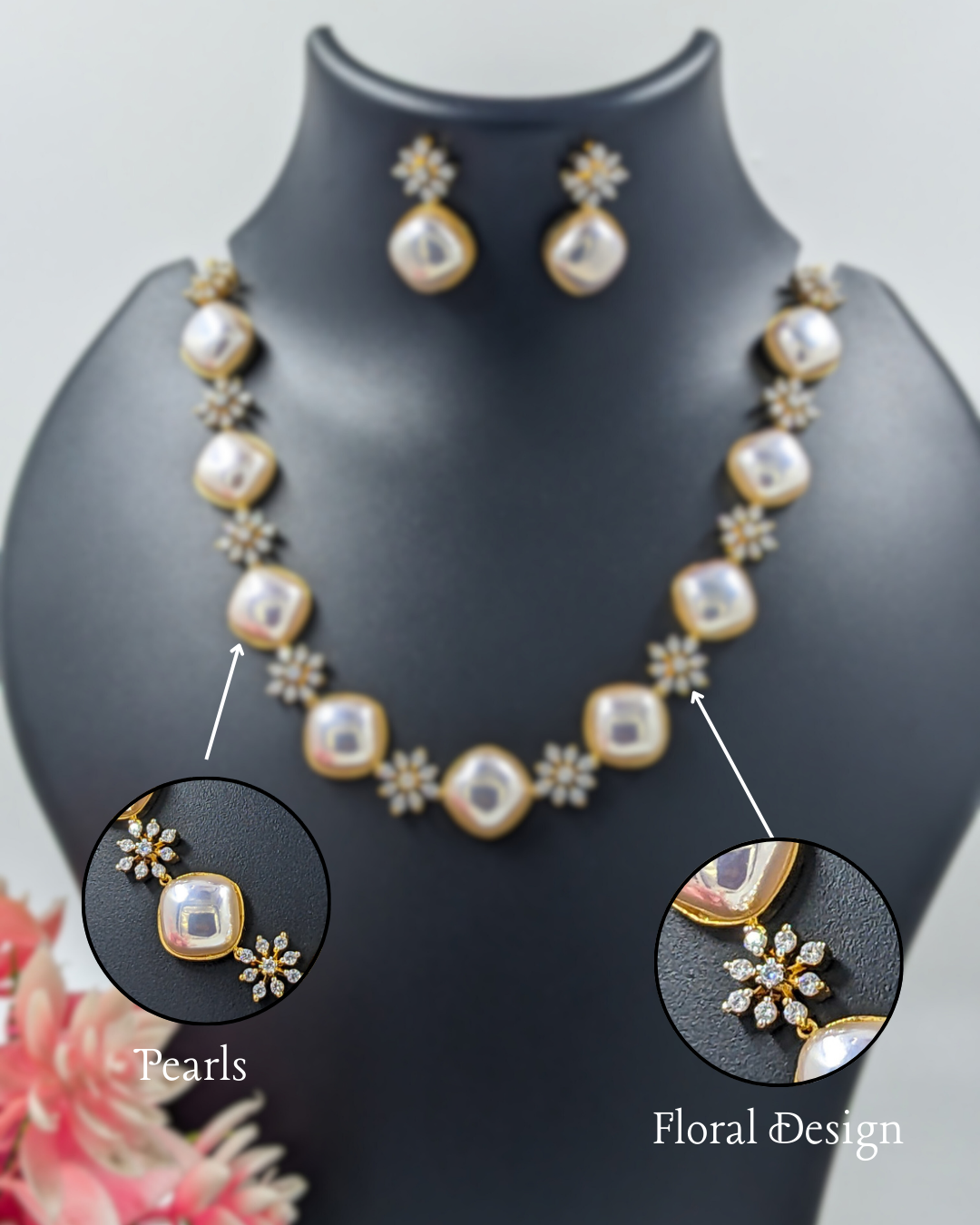Pearl & Gold Floral Necklace Set With Earring For Gifting