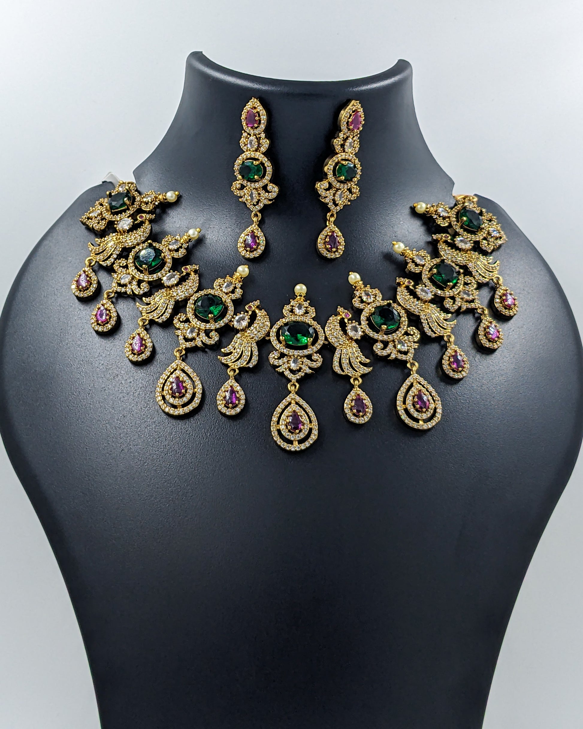 Embrace the majestic dance of the peacock with our Mayuri Set, a tribute to the national bird of India. This antique gold-plated necklace features a breathtaking design, with intricate motifs resembling a peacock's graceful form. Adorned with sparkling green and deep pink stones, the set captures the vibrant hues of a peacock's plumage. The cascading drops and delicate pearls add a touch of regal elegance. The matching earrings beautifully echo the necklace's grandeur, making this set a perfect choice for weddings, festive occasions, or any event where you wish to make a bold, traditional statement.