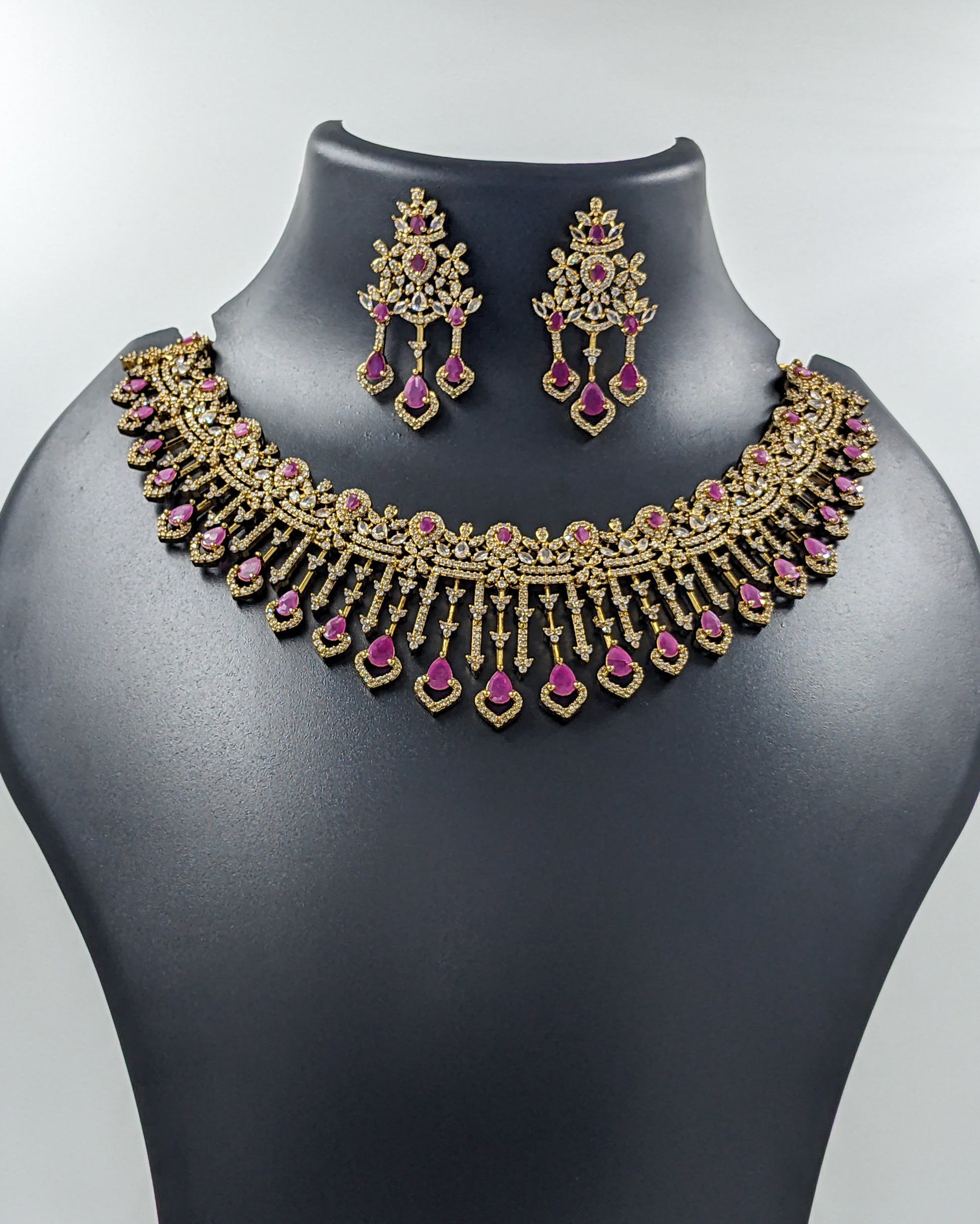 "Step into a world of timeless romance and dance with our Raasleela Set. This exquisite necklace, with its antique gold finish, is a celebration of intricate artistry. The vibrant ruby-like stones are set in a delicate pattern, from which a graceful cascade of dazzling pink tear-drop pendants dangles, creating a look of enchanting elegance. The intricate detailing and brilliant cubic zirconia stones add a touch of modern sparkle to this classic design. The matching earrings perfectly echo the necklace's grandeur, making this set a perfect choice for weddings, festive occasions, or any event where you wish to radiate traditional charm and sophistication.